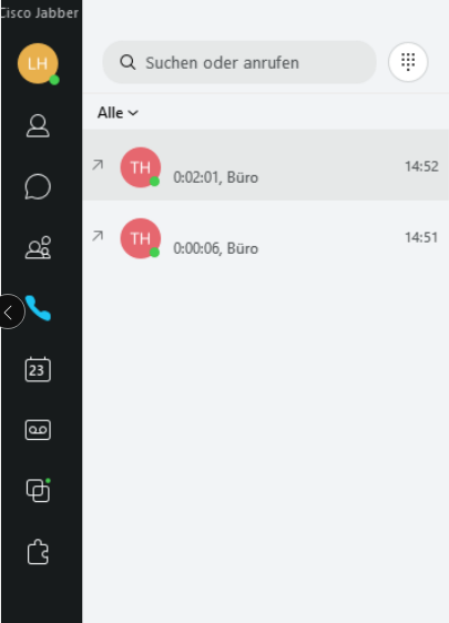 Der Anrufverlauf im Cisco Jabber Client zeigt eine Übersicht der zuletzt getätigten, angenommenen und verpassten Anrufe. Dieser Bereich ermöglicht es, vergangene Gespräche schnell nachzuvollziehen oder erneut Kontakt mit einer Person aufzunehmen.