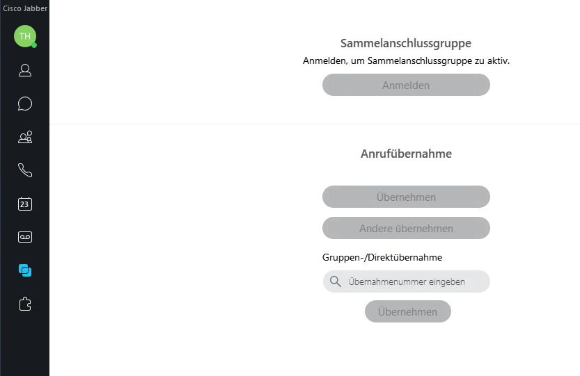 Der Bereich „Sammelan. und Übernehmen“ im Cisco Jabber Client dient zur Verwaltung von Anrufgruppen (Pickup Groups) und ermöglicht die Übernahme eingehender Anrufe innerhalb einer vordefinierten Benutzergruppe.