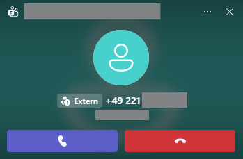Wenn Sie einen eingehenden Anruf in der MS Teams Desktop App erhalten, erscheint ein separates Benachrichtigungsfenster am Bildschirmrand. Dieses zeigt den Namen oder die Telefonnummer des Anrufers, die Anrufquelle (z. B. „Extern“) sowie zwei Schaltflächen zur Steuerung des Anrufs.