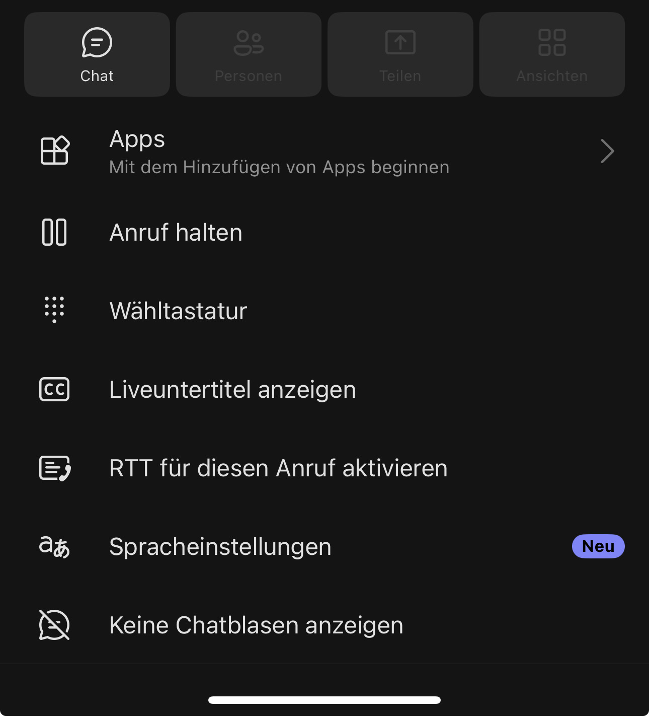 Diese ermöglichen es, Gespräche zu steuern, Inhalte zu teilen oder zusätzliche Optionen zu nutzen – alles übersichtlich in der unteren Bildschirmhälfte angeordnet.