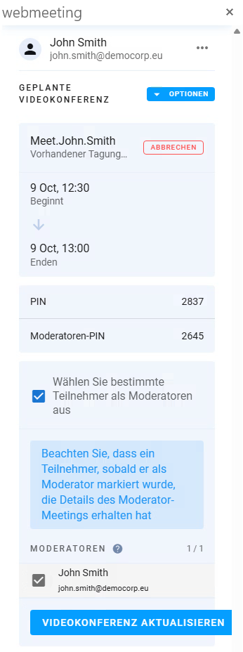 - PIN: Die Zugangspins für Teilnehmer und Moderatoren sind ausschließlich über das Portal anpassbar. Um zu den Einstellungen zu gelagen, klicken Sie auf Optionen