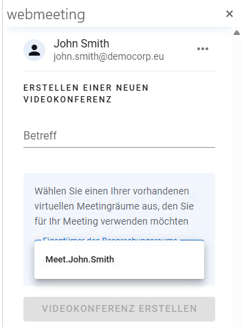 Über den "Videokonferenz Erstellen"-Buttonin der Menüleiste, können Sie im Anschluss zwischen den erwähnten Meeting-Räumen auswählen. Im Normalfall ist hier nur der persönliche Raum sichtbar.